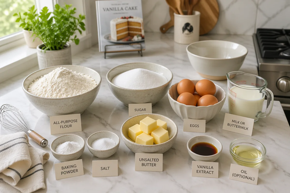 Let us talk ingredients, because this is where most vanilla cakes quietly go wrong. You do not need anything wild, but you do need to use the right versions of the basics. This is my go to list for a standard two layer cake, baked in two 8 inch pans.