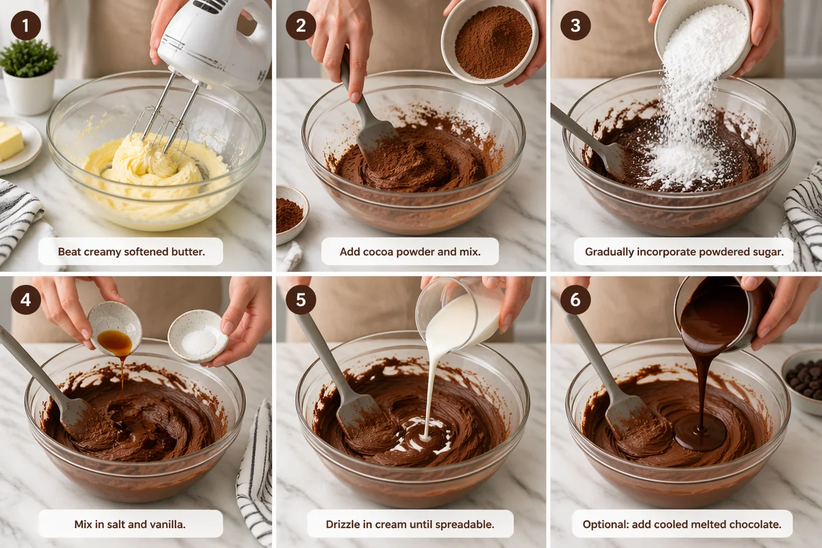 Beat the butter until it looks creamy. Add cocoa powder and beat again. Then add powdered sugar in a couple rounds so it doesn’t explode everywhere. Add salt and vanilla. Drizzle in cream a little at a time until it spreads easily. If you want it darker and denser, mix in a bit of melted chocolate that has cooled down (warm chocolate can make it greasy).