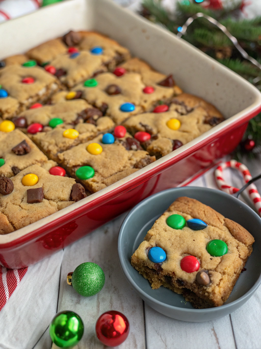 - Festive M&Ms: 1 ½ cups, divided. Use the classic red and green holiday mix. We’ll mix one cup in and save half a cup to press on top for that picture-perfect finish.