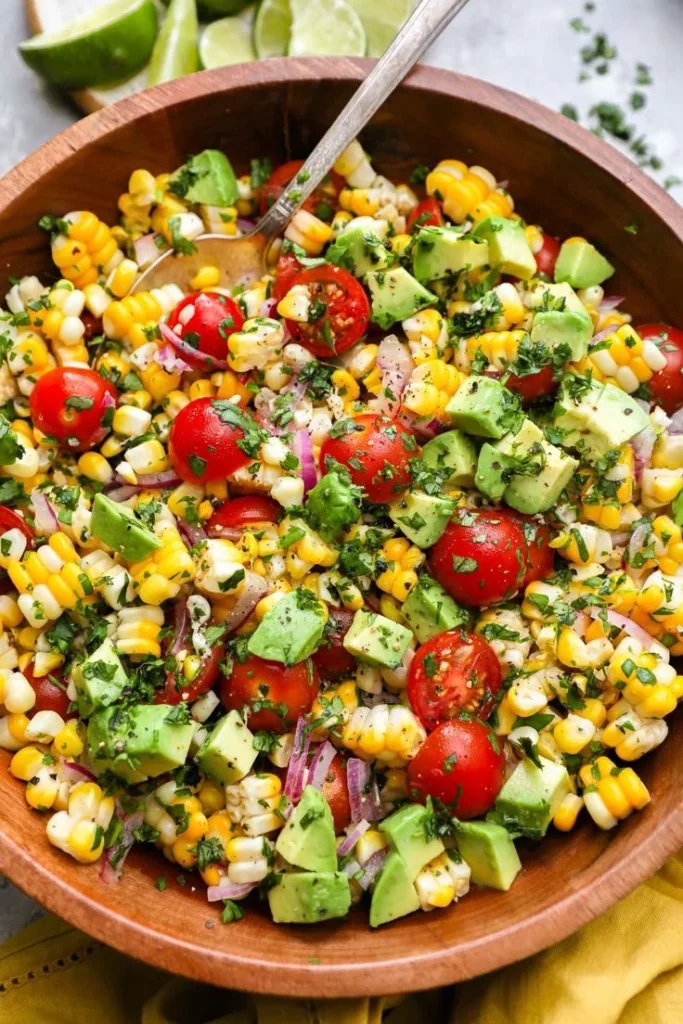 - In a large bowl, combine the corn, avocado, red bell pepper, onion, cherry tomatoes, and cilantro.